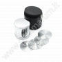 Diametro esterno 48 mm; 42 piattini con mezze misure e intere, da 000 a 20. Con custodia in metallo e in similpelle.