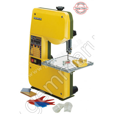 Motore silenzioso a 220 V, trasmissione con cinghia dentata optibelt, regolazione della velocità da 180 a 330 metri/min. sbraccio 150 mm, altezza massima di taglio 85 mm, piano di lavoro 200x200 mm.
